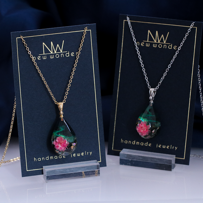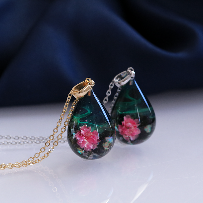 This aurora pendant has a shimmering background, giving a softness to the pendant while adding to the aurora effect. Smaller details include opal flakes and fine sparkling pigments.