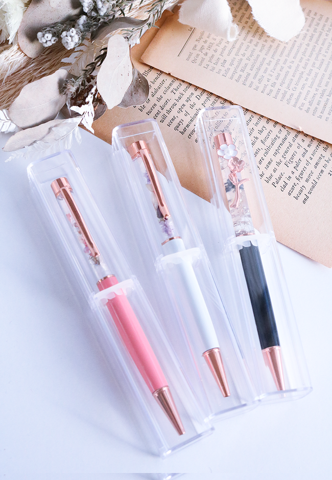 All pens are black ink. Contains preserved flowers, power stones and opal flakes.