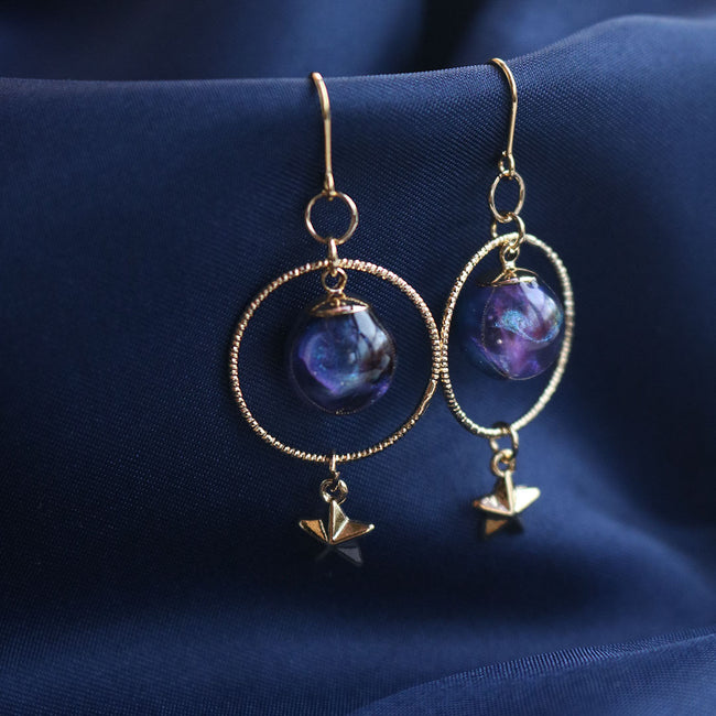 Beautiful space-themed orbs set on gold ear studs with a dangling elegant design. These are small and dainty, making it great to wear with any outfit or everyday wear.