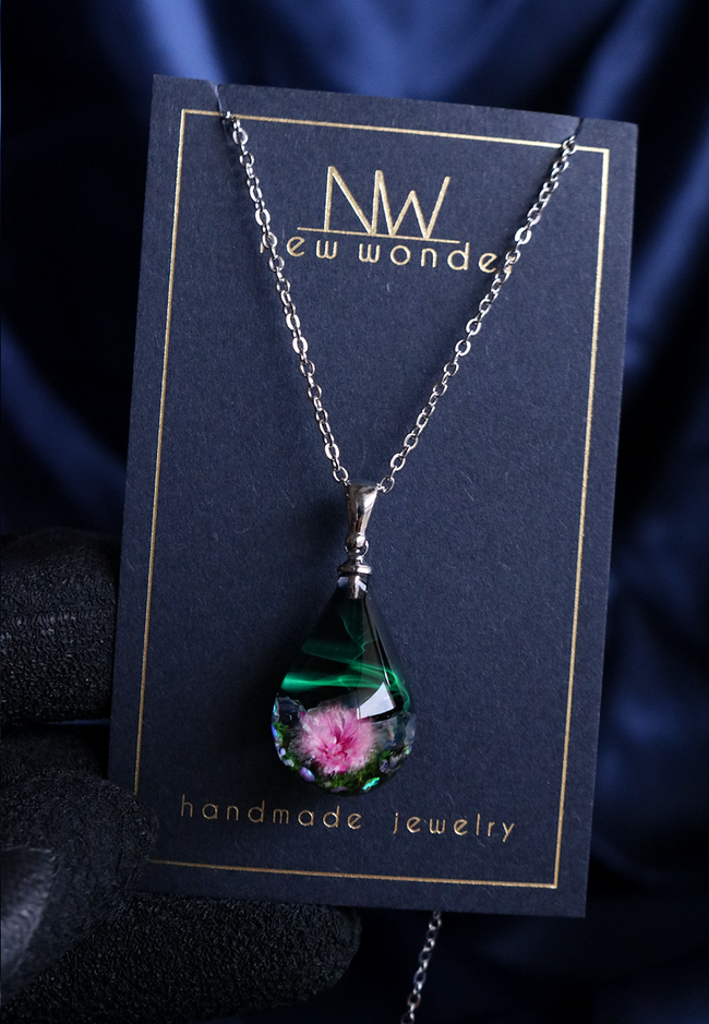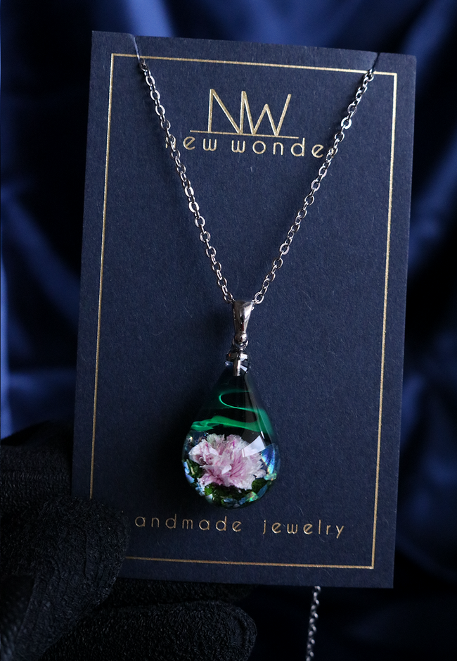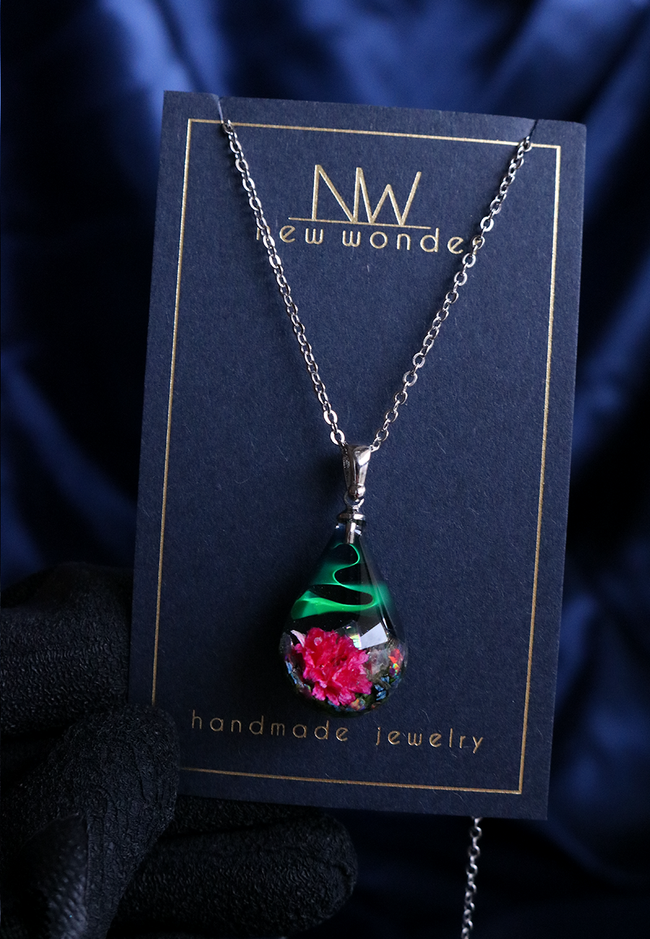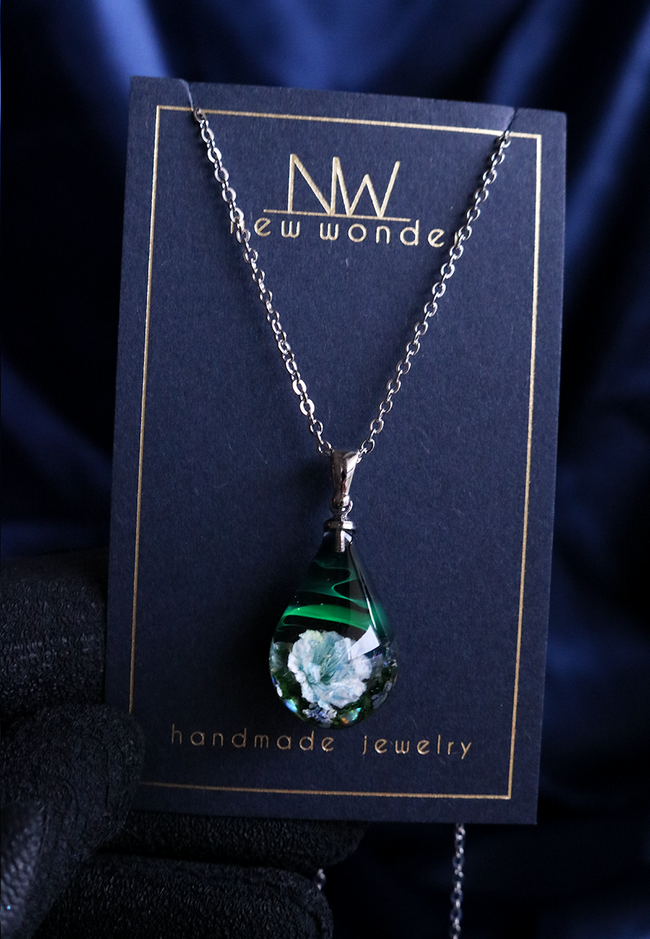 Behind the flower are glass, iridescent shards that sparkle in the light. Smaller details include opal flakes, smaller flowers and fine sparkling pigment.
