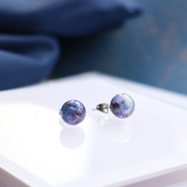 Beautiful space-themed orbs set on stainless steel ear studs for customers who may be more sensitive to metal. These are small and dainty, making it great to wear with any outfit or everyday wear. Available in 8mm orbs and 10mm orbs. Please choose which size you’d like.